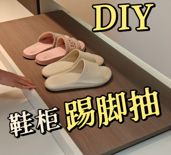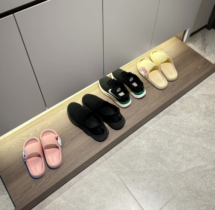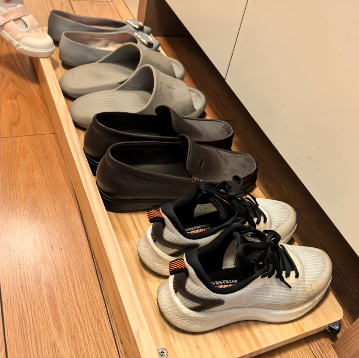 而最关键的设计,就是在鞋柜最下面做一个踢脚抽,这样换下来的鞋子,直接放在踢脚抽里面,轻轻踢一下,踢脚抽就被踢进去了,鞋子被完美收纳起来,干净又卫生。
