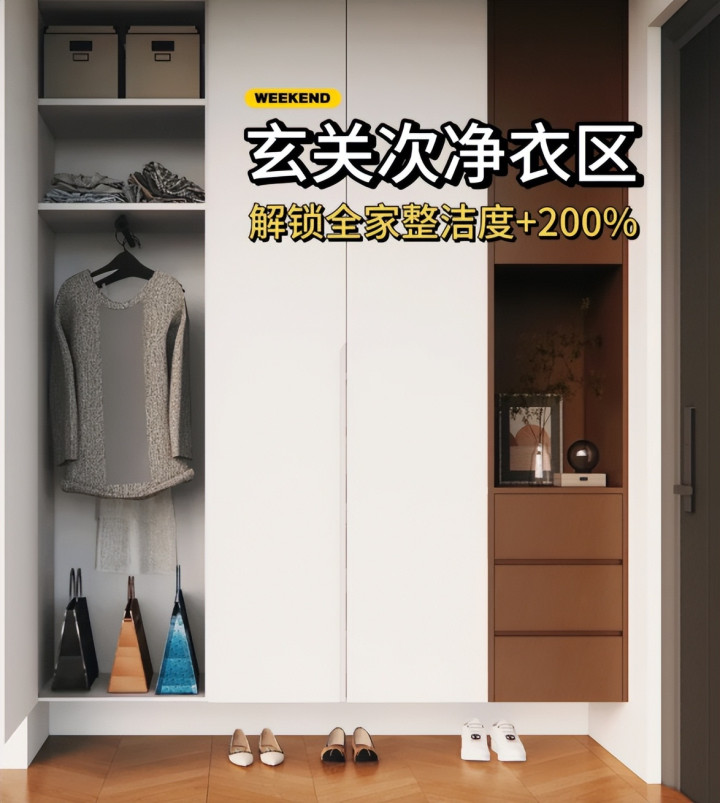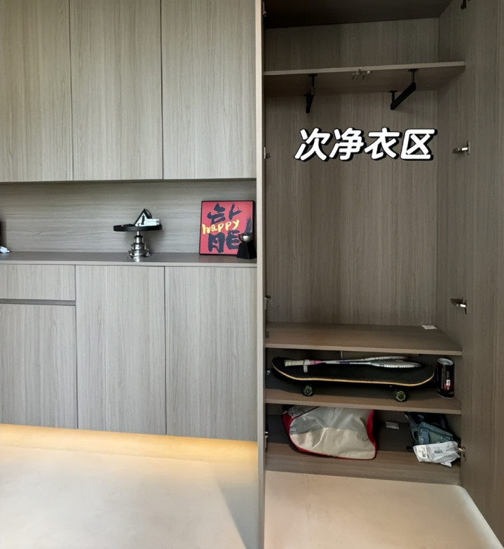 如果玄关空间小,没有地方做次净衣区,难么可以把次净衣区放在卧室里面,也可以买一个可以移动的衣架,用来挂衣服、收纳衣服都刚刚好。